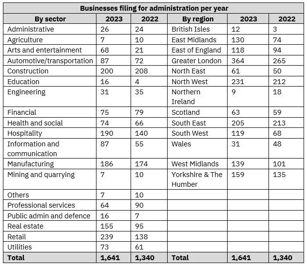 A total of 1,641 businesses, 205 of which came from the South East, filed for administration last year – marking a 22% increase compared to 2022 and 91% rise in comparison to 2021.