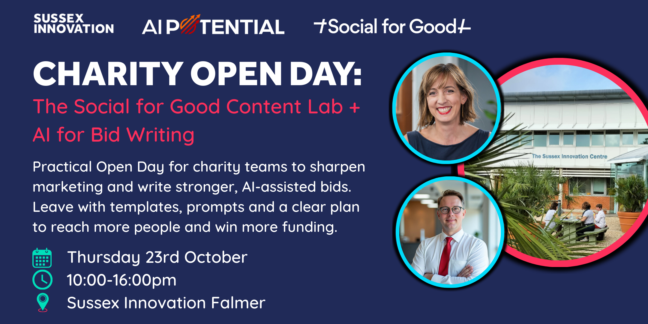 For further details and how to register: https://www.eventbrite.co.uk/e/charity-open-day-the-social-for-good-content-lab-ai-for-bid-writing-tickets-1701278372409?aff=oddtdtcreator